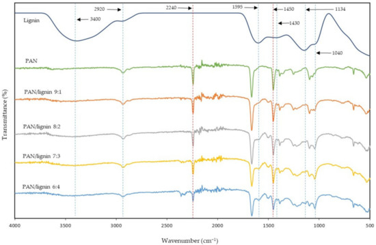 ATR-FTIR technique was used to analyze the PAN, lignin, and PAN/lignin nanofibers before and after selective chemical dissolution. Figure 1 shows the FTIR spectra of PAN, lignin, and PAN/lignin nanofibers. The ratio of PAN: lignin was varied at 9:1, 8:2, 7:3, and 6:4 to study the effect of different ratios on the fabricated PAN/lignin nanofibers. The IR spectrum of lignin shows the major lignin bands at 3400 cm−1 (O–H stretching), 1595 cm−1 (aromatic skeletal vibration), 1430 cm−1 (C–C stretching with C–H deformation), 1134 cm−1 (C–H deformation), and 1040 cm−1 (C–O deformation) [33]. In Figure 1, it can be seen that the higher the lignin content in the fiber, the higher the intensity of the lignin peaks at 1595 cm−1, 1134 cm−1, and 1040 cm−1. A small peak at 2920 cm−1 indicates a stretching of the alkyl C–H bond and a stretching of the intermolecular hydrogen bonding of the O–H group, which is associated with the hydroxyl group in the lignin [34]. A strong peak at 2240 cm−1 indicates the C≡N group of PAN; the intensity of the peak was decreased as the ratio of PAN decreased. A peak at around 1450 cm−1 corresponds to the bending of the CH2 scissoring of PAN [35]. The intensity of the peak at 1450 cm−1 was reduced when the ratio of lignin increased. As can be seen in Figure 1, the main peak position of PAN did not shift for all the nanofibers, demonstrates that the blending of PAN and lignin only involves physical blending.
