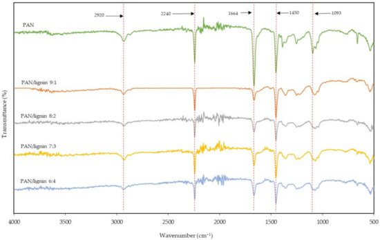 The FTIR spectra of the PAN/lignin nanofibers after the selective chemical dissolution process when compared to PAN and lignin is shown in Figure 2. The IR spectrum of PAN shows peaks at around 2920, 2240, 1664, and 1450 cm−1. These peaks indicate the alkyl C–H bond stretching, C≡N stretching, C≡N stretching, and CH2 bending, respectively [36,37,38]. Selective chemical dissolution was performed to remove the lignin from the nanofibers. The results showed that, for the nanofibers after treatment, most IR peaks in PAN/lignin nanofibers exhibited mainly belong to PAN. In comparison, the peaks that belong to lignin, such as the peaks at around 1595 cm−1 and 1040 cm−1, were reduced significantly. This is because the lignin content in the nanofibers was successfully removed through the selective chemical dissolution process.