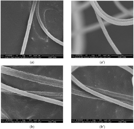 FESEM micrograph of nanofibers with various PAN: lignin ratios (a) PAN, (b) 9:1, (c) 8:2, (d) 7:3, (e) 6:4 ratio before selective chemical dissolution, and (a’) PAN, (b’) 9:1, (c’) 8:2, (d’) 7:3, and (e’) 6:4 ratio after selective chemical dissolution.