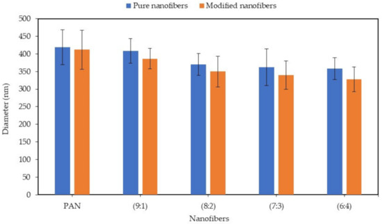 Graph of the diameter of nanofibers before (pure nanofibers) and after (modified nanofibers) selective chemical dissolution.
