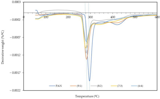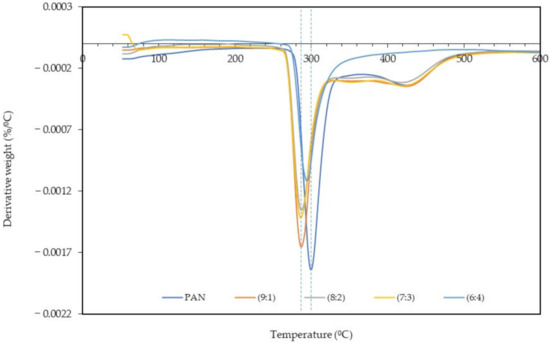 The derivative thermogravimetry (DTG) and TGA analyses of the PAN: lignin nanofibers before and after selective chemical dissolution was carried out to study the thermal stability of the samples. Figure 5 and Figure 6 show the DTG thermogram at different ratios of PAN: lignin nanofibers, from 50 °C to 600 °C. TGA thermograms of nanofibers before and after selective dissolution are shown in Supplementary Materials (Figures S1 and S2). The DTG and TGA thermograms of nanofibers both before and after selective chemical dissolution show a similar trend. The first weight loss can be observed at 50–120 °C and is due to the loss of water molecules that are bound to the nanofibers. TGA thermograms of the nanofibers (Figures S1 and S2) show that all the nanofibers gradually decomposed at a higher temperature range. From DTG and TGA thermograms, the main degradation began at 275 °C for PAN nanofibers, attributed to the pyrolysis of the nanofibers [40]. The addition of lignin to the nanofibers (PAN/lignin nanofibers) lowered the onset degradation temperature of the fibers (~260 °C) compared to PAN nanofibers; however, there was no significant difference between the various ratios of lignin in the fibers. The addition of lignin slightly reduced the thermal stability of the nanofibers. When comparing the results before and after selective chemical dissolution, the onset degradation temperature of the PAN/lignin nanofibers was slightly higher than before selective chemical dissolution, possibly due to the removal of lignin and because the nanofibers are mostly composed of PAN, which has a higher thermal stability than lignin. However, after selective dissolution, the onset temperature of the PAN/lignin nanofibers was still slightly lower than PAN nanofibers (Figure 6). It is noticeable that the PAN/lignin (8:2) in Figure S1 and the PAN/lignin (6:4) in Figure S2 show that weight loss exceeded 100%. The possible explanation for this is that the PAN fiber can have a reaction with nitrogen under thermal treatment [41] with a resulting weight increase of over 100%.