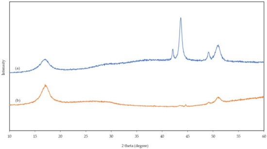 Figure 7 shows the sample result of XRD analyses carried out to study the crystallinity of nanofibers before (pure 7:3 PAN/lignin nanofibers) and after (modified 7:3 PAN/lignin nanofibers) selective chemical dissolution. The XRD diffraction pattern of the nanofibers before and after selective chemical dissolution shows a broad peak at around 17°, which can be ascribed to (100) crystallographic planes of PAN due to their amorphous nature [14,42]. Nevertheless, the intensities of peaks at 17° were increased with the removal of lignin content in PAN-based nanofibers after selective chemical dissolution. Crystallinity decreased with the higher lignin content as lignin is a biopolymer consisting of amorphous phenyl propylene [43]. The XRD patterns of the pure 7:3 PAN/lignin nanofibers show characteristic peaks of 2 theta located at 42°, 44°,49°, and 51° that may be due to the blend of PAN with lignin. Once modified, intensity of all these peaks were reduced due to lignin removal.