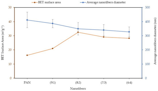 The interrelationship between the average diameter and the BET-specific surface area of nanofibers as a function of a ratio of PAN/lignin nanofibers after selective chemical dissolution is shown in Figure 8. From the graph, it can be seen that the higher the composition of lignin in the nanofibers, the lower the average diameter of the fiber and the higher the BET-specific surface area. The optimum surface area of the porous nanofibers can be obtained by only a 20% incorporation of lignin fibers with a very small pore diameter (5.02 nm) and pore volume (0.1974 m3g−1).