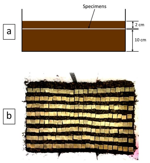 (a) Setup of biodegradability test (side view) and (b) actual arrangement of specimens on soil surface before being covered with another 2 cm layer of soil (top view).