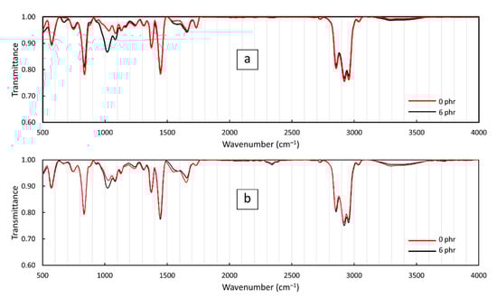 The FT-IR spectra of the CS/R-VNRL and CS/RP-VNRL composites are shown in Figure 3a,b, respectively. For the pristine R-VNRL and RP-VNRL shown as red lines in Figure 3, dominant peaks were observed at 839 cm−1 (C=C bending), 1039 cm−1 (C–O stretching), 1085 cm−1 (C–O stretching), 1373 cm−1 (C–H bending), 1448 cm−1 (C–H bending), 1660 cm−1 (C=C stretching), 1773 cm−1 (C=O stretching), 2850–2960 cm−1 (C–H stretching), and 3215–3525 cm−1 (O–H stretching) []. The results of FT-IR for the pristine R-VNRL and RP-VNRL in this work agreed with the results from Ibrahim et al., which showed similar peak positions and band intensities for R-VNRL composites []. In particular, for the 6-phr CS/R-VNRL and 6-phr CS/RP-VNRL composites, peaks at 1039 and 1085 cm−1 were amplified compared to those of pristine samples. These enhanced band intensities of C–O stretching were mostly due to the added CS, which also had the dominant FT-IR peaks at around 1028 and 1066 cm−1 [,], resulting in noticeably higher band intensities at the peaks around 1039 and 1085 cm−1. These changes in the FT-IR results confirmed the presence of CS in the R-VNRL and RP-VNRL matrices.