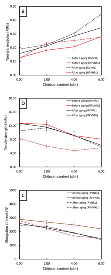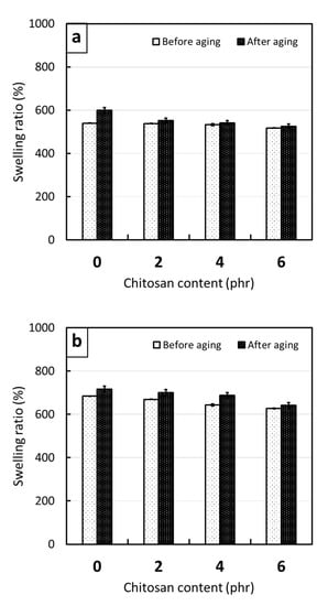 where Eaged, E0, TSaged, and TS0 are the elongation at break of aged specimens, the elongation at break of non-aged specimens, the tensile strength of aged specimens, and the tensile strength of non-aged specimens, respectively []. The results of S obtained in this work are shown in Table 5, which indicated that CS/R-VNRL composites exhibited higher values of S than those of CS/RP-VNRL composites at the same CS content. The smaller values of S in RP-VNRL composites were mainly due to lesser crosslink densities (larger swelling ratios in Figure 6) in RP-VNRL than those in R-VNRL composites. It should be noted that the R-VNRL composites with the addition of CS (for all CS contents) had the S values greater than that of the pristine R-VNRL. This finding clearly indicated the enhanced resistance to thermal degradation of the CS/R-VNRL composites, mostly due to the known-property of CS in antioxidation [].