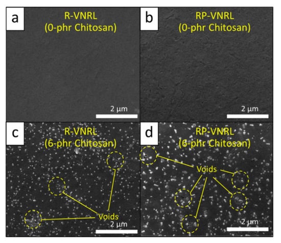 SEM images showing morphological properties of (a) pristine R-VNRL, (b) pristine RP-VNRL, (c) 6-phr CS/R-VNRL composites, and (d) 6-phr CS/RP-VNRL composites. All images are at a magnification of ×20,000.