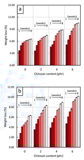 Percentage weight loss (% weight loss) of (a) CS/R-VNRL composites and (b) CS/RP-VNRL composites, with varying CS contents of 0, 2, 4, and 6 phr. The % weight loss was observed for a total of 8 weeks. Error bars indicate ± standard deviation.