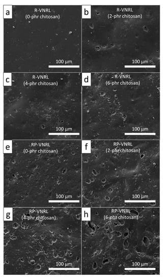 The biodegradability, as represented by the % weight loss after soil burial for 8 weeks, of the CS/R-VNRL and CS/RP-VNRL composites is shown in Figure 7. The results indicated that the specimens exhibited varying degrees of biodegradability, with higher % weight loss in the specimens containing higher CS contents. For example, the % weight loss of pristine R-VNRL and RP-VNRL specimens after 8 weeks of soil burial were just 6.5 ± 0.1% and 6.4 ± 0.1%, respectively, while the R-VNRL and RP-VNRL composites containing 6 phr of CS exhibited % weight loss values of 10.5 ± 0.1% and 10.2 ± 0.1%, respectively, indicating noticeably enhancement in their biodegradability of 61.5% and 59.4%, respectively. These results were due to the faster biodegradation of CS by microorganisms compared to those of NR, as reported by Nakashima et al., where CS film exhibited % weight loss values of 98.9% and 99.1% after being buried in red clay and paddy soil, respectively, for just 1.5 months []. This fast degradation of CS resulted in the increased void formation and the loss of integrity of the NR matrix; so that the NR matrix could be broken down into smaller particles by microorganisms in shorter periods of time [,]. The micrograph images of all biodegraded specimens are shown in Figure 8, which revealed that specimens containing CS, especially at 6 phr (Figure 8d,h), clearly had more and larger voids in the R-VNRL and RP-VNRL matrices (average void sizes of 15.1 ± 2.2 µm and 26.2 ± 3.4 µm, respectively) compared to the pristine R-VNRL and RP-VNRL (average void sizes of 2.5 ± 0.7 µm and 9.7 ± 1.2 µm, respectively). These findings positively supported the biodegradation results, which indicated higher % weight loss in the specimens with high CS contents. The accelerated % weight loss and biodegradability of the R-VNRL and RP-VNRL composites with the addition of CS implied that CS effectively acted as a bio-filler and enhanced the biodegradability of the composites, which could reduce substantially the amount of time needed for waste disposal.
