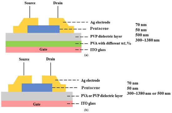 Cross-section structure of the fabricated OTFT with: (a) high-K PVA/low-K PVP bilayer gate dielectric; (b) PVA or PVP single gate dielectric.
