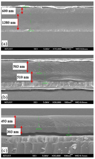 where C is the capacitance of the gate insulator layer, A is the electrode area, ε0 is the vacuum dielectric constant, and t is the thickness of the dielectric layer. Generally, the adhesion of the PVA solution was controlled by the PVA concentration, the main factor for the thickness of PVA under the same rotation speed. Thus, we prepared different concentrations of PVA solution to acquire an optimal value for the capacitance of PVA. The different thicknesses with the various PVA concentrations, including 25, 16, and 12 wt%, were estimated to be 1380 nm, 510 nm, and 300 nm, respectively, as shown in Figure 2. As previously mentioned, organic dielectric thickness suffers from severe performance degradation through the thickness reduction process and then induces complexity to the device []. Therefore, we fixed the thickness of the second PVP dielectric layer at about 500 nm, which was a reasonable value for OTFT fabrication.