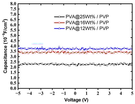 Capacitance–voltage measurement of the bilayer gate dielectric with different PVA concentrations (25%, 16%, and 12% weight percentage) and the PVP layer of 500 nm.