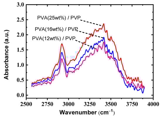 FTIR measurement of the bilayer gate dielectric with different PVA concentrations combined with a PVP of 500 nm.