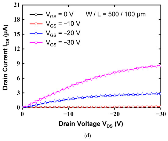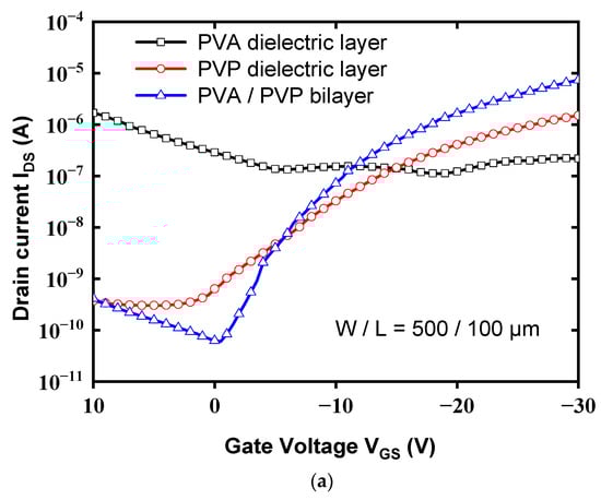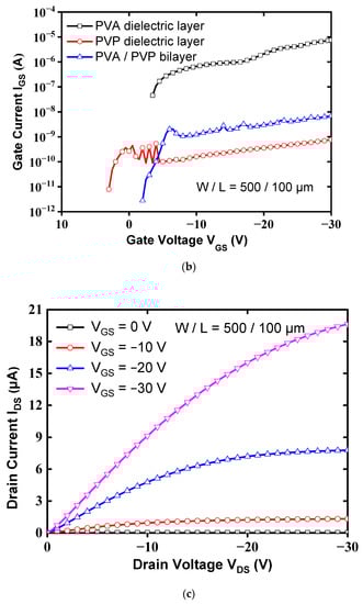 Figure 5 shows the transfer characteristics (IDS-VGS) of the OTFT with the PVA (12 wt%)/PVP bilayer gate insulator, single PVA gate layer, and single PVP gate layer, all of which were measured at a drain voltage (VDS) of −20 V. Figure 5b shows the gate leakage current of the device with a high-K PVA/low-K PVP bilayer is significantly decreased by about four orders of magnitude than that of the device with the single PVA structure. Additionally, the gate current with a high-K PVA/low-K PVP bilayer is comparable to that with a single PVP layer. Figure 5c,d shows the output curves (IDS–VDS) of the devices with high-K PVA/low-K PVP and PVP dielectrics, respectively, as a function of drain/source voltage (VDS) for gate/source voltages (VGS) of 0, −10, −20, and −30 V. As a result, the output current (IDS) of the devices with a high-K PVA/low-K PVP bilayer gate insulator is obviously larger than that of the devices with PVP dielectric layer. Thus, the proposed scheme with a high-K PVA/low-K PVP bilayer as a gate insulator will be a good candidate, which is not only for improving the electrical characteristics of the pentacene-based OTFTs but also for acting as a good gate insulator with reduced gate leakage current. The field-effect mobility and threshold voltage were calculated in the saturation region by fitting the |IDS|1/2 curve based on Equation (3):
