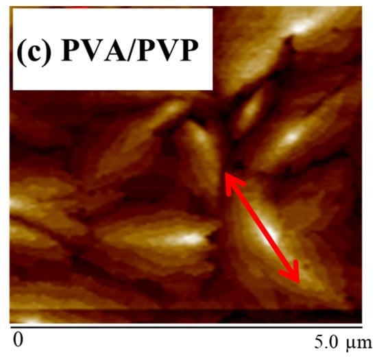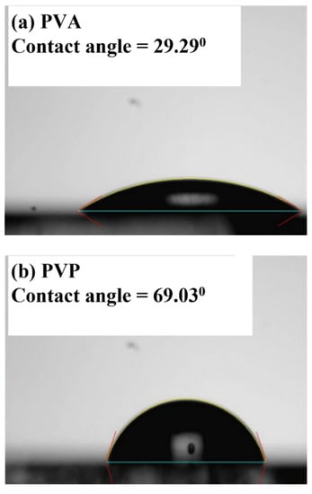 It was also found that the device with a single PVA dielectric did not show the switching characteristics of a semiconductor. Because of that, the hydrophilic surface of PVA results in poor surface conditions, which inhibits the growth of the pentacene grain. It has been reported [] that the hydrophilic condition can be represented by the measured contact angle of the surface. The contact angle of the samples with a single PVA, single PVP, and bilayer high-K PVA/low-K PVP, respectively, were measured using the sessile drop method, as shown in Figure 6. The single PVA sample presented a low contact angle of 35.92°, which represented the hydrophilic surface. Yu et al. [] proposed that the hydrophilic surface inhibits the growth of pentacene causing a small grain size, resulting in high-density grain boundary defects, leading to poor carrier transportation. The contact angles of the single PVP and high-K PVA/low-K PVP surfaces were similar and comparable at 69.03° and 66.54°. The contact angle of the single PVP and high-K PVA/low-K PVP surfaces showed greater hydrophobic activity than that of the single PVA surface. Table 2 shows the contact angles of DI water and diiodomethane and the surface energies of gate insulators. The γd and γp represent dispersion and polar components of the surface energy (γ), respectively. It shows the surface energy values, 72.57 mJ/cm2, 52.95 mJ/cm2, and 50.90 mJ/cm2 for High-K PVA, high-K PVA/low-K PVP, and low-K PVP, respectively. The decreased surface energy of the PVA/PVP bilayer is comparable to that of the PVP layer due to the removal of –OH groups from the PVP by the cross-linking process. It is noted that the surface energy of PVA is higher than that of PVA/PVP or PVP layers due to lots of –OH groups. It is also consistent with the measured contact angles in Figure 6 because the smaller contact angle represents the higher surface energy. The smaller contact angle and higher surface energy of PVA show the hydrophilic surface with OH groups, which could result in a stronger interaction between the dielectric surface and the pentacene molecules during the deposition to inhibit the growth of the pentacene grain. In contrast, pentacene exhibits large grains when grown on the hydrophobic insulator surface with a high contact angle and low surface energy.