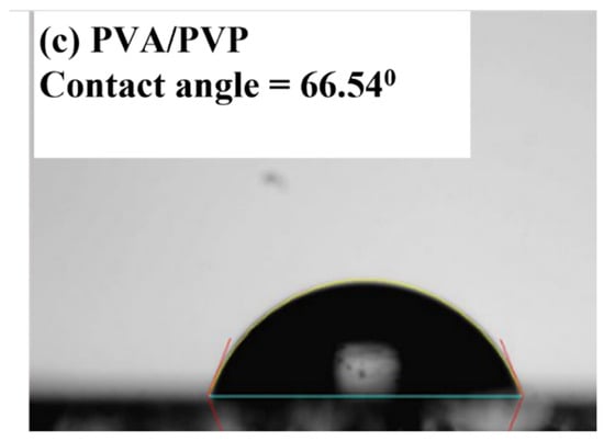 Contact angles of the different dielectric surfaces: (a) PVA, (b) PVP, and (c) high-K PVA/low-K PVP.
