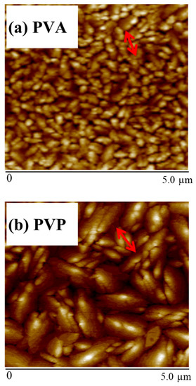 Figure 7 shows that the PVA layer has the smallest grain size and is also consistent with the smallest contact angle. The average grain sizes of pentacene were 1.58 and 2.16 µm for the PVP dielectric layer and the high-K PVA/low-K PVP bilayer, respectively. Since the PVP layer of the high-K PVA/low-K PVP bilayer was deposited onto the organic PVA layer instead of the inorganic ITO surface as shown in Figure 1a,b, it was presumed that the surface morphology of the high-K PVA/low-K PVP bilayer gate dielectric was more suitable than that of the PVP single layer. Thus, the more suitable surface morphology of the high-K PVA/low-K PVP bilayer could significantly increase the pentacene grain size, which also caused the obviously improved μFE of the device with a high-K PVA/low-K PVP bilayer. It is well known that there are numerous traps in the grain boundary of the polycrystalline pentacene film. The film with the larger grain size has a reduced amount of grain boundary, resulting in a reduced number of traps in the film. In regard to the correlation between mobility and grain size, many reports have described the mechanism [,]. Matsubara et al. found that carrier mobility corresponds to crystalline domain size [,], which is consistent with our study.