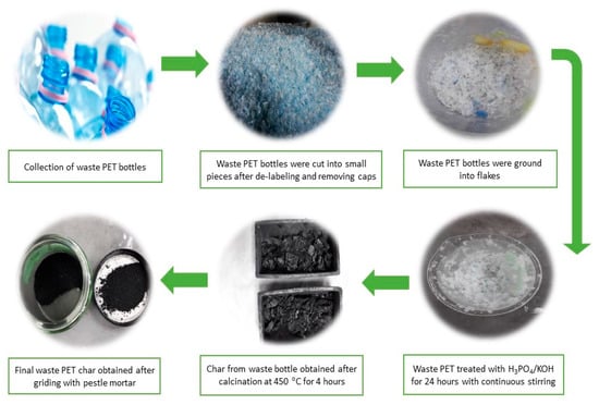 The activities carried out by humans are having a huge impact on the environment. There are always dire consequences of an activity on the natural resources and environment, as we tend to interfere in the natural mechanism of recycling. Polymers have been increasingly popular in recent years and have been used widely in almost every field of life. Around 300 million tons of plastic waste is generated globally each year. The number of benefits obtained from the usage of polymers is phenomenal, and that is why they replaced glass in 1970s, but this does not negate the fact that they cause pollution to our environment [1]. Over the passage of time, they have become an important material of our society because benefits associated with them, such as ease of adaptability in design, thermostability, transparency, durability as compared to glass and low cost. The consumption of PET has shown a fast rate of growth, due to the increase in growth of the plastic bottle market [2]. Plastic solid wastes are accumulating day by day in our surroundings, and this is posing a huge problem in their disposal without contaminating the environment. The amount of PET that is being recycled in a number of manners in the past is less, but its potential to be converted into activated carbon has been explored recently [3,4]. PET falls into the category of non-biodegradable plastic waste and is being dumped in the landfills and oceans, which poses a great danger to ecology, wild life and human health [5]. Sardon and Dove [6] anticipated that, by 2050, the mass of plastic waste will be more than that of fish, because plastic trash continues to rise, along with rapid disposal and weak recycling methods. All of the data suggest that plastic pollution has already become a severe concern, with far greater consequences than previously assumed.