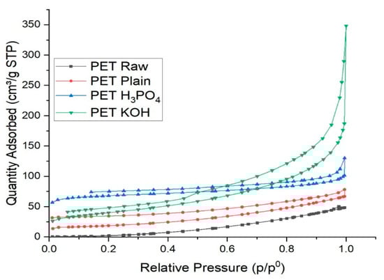 The adsorption isotherms of PET Raw have few values at the region of small relative pressure. Therefore, the sample can be presumed to have few micropores. The adsorption isotherms of after the heat treatments, such as PET Plain, PET H3PO4 and PET KOH, indicated the gap at the right end of the graph (Figure 3), that is, near 1 of relative pressure.
