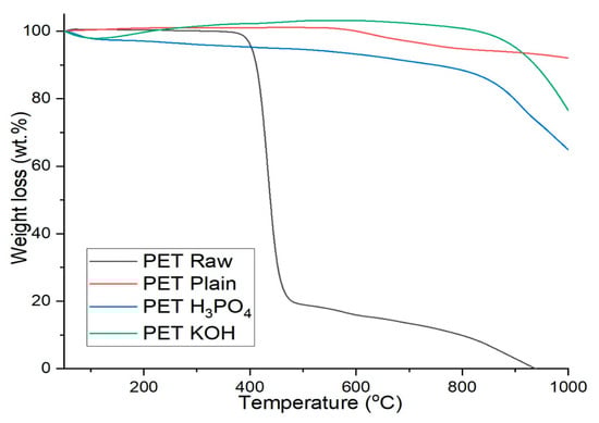 In this work, thermogravimetric analysis was carried out to analyze the thermal stability and decomposition rate of PET Raw, PET Plain, PET H3PO4 and PET KOH. Figure 4 shows that the gradual weight loss of PET at different temperatures. A significant weight loss started at 360–490 °C, which is due to the degradation of the PET components (first degradation). The second degradation stage occurred at 500 °C with very slow change and completed at around 950 °C. The TGA of PET Plain shows that there is an initial increase in weight due to the absorption of moisture. Meanwhile, weight loss is seen at a temperature of 530 °C, which indicates that the sample is quite stable, and it continues to decompose till 950 °C, with a total weight loss of 92% of PET polymer, which is associated with the thermal decomposition of the carbon sheet’s structure [19]. On the other hand, the TGA of PET H3PO4 exhibited marginal weight reduction attributed to the moisture loss at around 70 °C. At 90 °C, the sample starts to show an increase in weight loss that continues till 600 °C, being due to the breakdown of phosphoryl group. Notably, at 830 °C, the PET H3PO4 starts further decomposition, and the weight loss is due to the breakdown of activated carbon. Remarkably, the TGA of the PET KOH shows an excellent stable characteristic from 50 to 800 °C. Beyond 800 °C, the catalyst starts to decompose with the mass loss being around 10%, which indicates that KOH play a vital role in stabilizing and decomposition rate of the PET KOH.