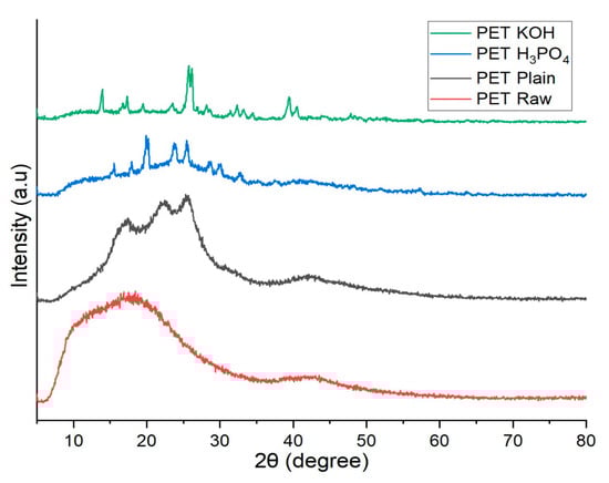 X-ray diffraction (XRD) spectra of PET Raw, PET Plain, PET H3PO4 and PET KOH.
