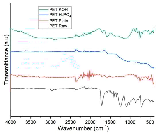 FTIR spectra of PET Raw, PET Plain, PET H3PO4 and PET KOH.