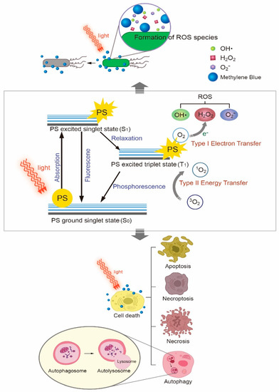 Methylene blue (MB), first extracted by the German chemist Heinrich Caro, has been recognized not only as a dye, but also as a medicine that has been used in the treatment of malaria (Figure 1) [1]. MB can stain malarial parasites in infected red blood cells [2]. Thyroid surgery and the treatment of methemoglobinemia and ifosfamide-induced encephalopathy are a few typical examples of MB applications (Table 1) [3,4]. Preliminary investigations suggest that MB may also be used in the treatment of septic shock, neurodegenerative diseases including Alzheimer’s disease, and cancers [5,6,7,8,9,10,11]. When intravenously pretreated, MB can also reduce the pain associated with injection of propofol, which induces general anesthesia [12]. Moreover, MB is reported to show antiviral activity against COVID-19 caused by severe acute respiratory syndrome-coronavirus 2 (SARS-CoV-2) [13]. It hinders the binding interaction between SARS-CoV-2 spike protein and angiotensin-converting enzyme 2 (ACE2), which is known as the entry point of the virus. MB is commonly available in the market as a form of solution (e.g., 0.5% MB injection USP). The recommended dosage of MB is between 1 and 4 mg/kg, and oral and intravenous administrations for 5 to 10 min are suggested [14]. A terminal plasma half-life of MB after intravenous administration is about 5 to 7 h [15]. Because of the phenothiazinium chromophore of MB, it absorbs light near 630–680 nm, resulting in the formation of reactive oxygen species (ROS), including singlet oxygen [16,17]. Hence, MB is a photosensitizer essential for photodynamic therapy (PDT). PDT is a well-documented and evolving therapy wherein photosensitizing molecules are photoactivated and react with oxygen, thus helping to create ROS [18,19,20,21,22,23]. There has been growing interest in applying PDT for a variety of benign and malignant diseases [21,24,25]. For example, a light-excited photosensitizer (PS) such as MB generates cytotoxic reactive oxygen species (ROS) from molecular oxygen and achieves specific cancer cell death or tumor tissue damage [21]. The sensitized PS is able to create a superoxide anion radical (O2•−), a hydroxyl radical (OH•), or hydrogen peroxide (H2O2) through proton or electron transfer (type I mechanism) while the type II mechanism results in the formation of singlet oxygen (1O2) [26]. ROS produced by PDT is responsible for cancer cell death, and there are several PDT-mediated cell death pathways: apoptosis, necroptosis, autophagy, and necrosis. Details of the molecular mechanisms associated with them have been previously explained (Figure 2) [27,28]. Likewise, these oxidizing molecules also react with bacterial biomolecules, resulting in the eradication of infectious bacteria [29]. Antimicrobial photodynamic therapy (aPDT) uses the same principle of cytotoxic ROS formation under a specific wavelength of light and is recognized as a potential option for treating multidrug-resistance bacteria [30]. Several nanomaterials such as gold nanoparticles (NPs), silica NPs, and upconversion nanoparticles (UCNPs) have also been studied as PS carriers to improve the clinical potential of the PDT modality [31]. These materials improve the localized delivery of PS and enhance the efficacy of the irradiation of a specific light on the targeted tissue [32]. Moreover, they can protect the PS molecules from photobleaching [33].