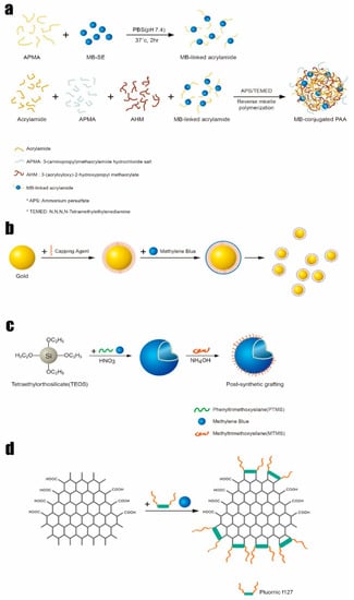 Fabrication techniques for methylene blue (MB) encapsulation. (a) MB-embedded polyacrylamide nanoparticles, (b) Gold nanoparticles electrostatically tethered with MB, (c) MB-embedded hollow silica nanoparticles, (d) Nano graphene oxide covalently tethered with MB.