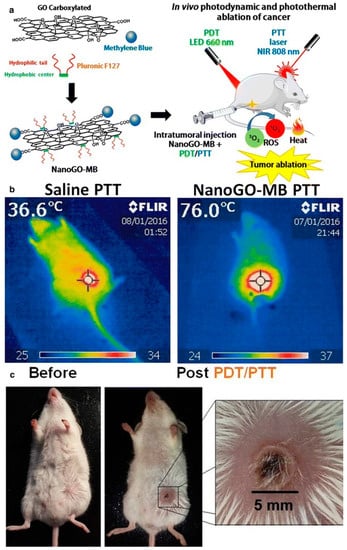Combined PDT/PTT treatments with nanoGO-MB. (a) Schematic representation of nanoGO-MB phototherapies. On both therapies, only the tumor region was exposed to the irradiation, thus the other areas were protected from the light. (b) Real-time thermal camera imaging during PTT treatment. A temperature increase of approximately 40 °C was observed only at the tumor region. In this study, the 4T1-Luc tumor-bearing mice were used. (c) Tumor site after combined PDT/PTT therapies. The healing tissue measured 5 mm. Reproduced from [55].