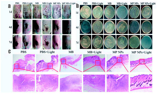 (a) Photographs of infected wounds in mice at different timepoints after different treatments: PBS, PBS + light, MB, MB + light, MPNPs, and MPNPs + light. (b) Photographs of bacterial colonies formation on LB agar plates from the infected wounds after different treatments. (c) H&E staining (Hematoxylin and Eosin) of tissue sections of MRSA infected wounds in mice with different treatments. The scale bar is 500 μm [94].