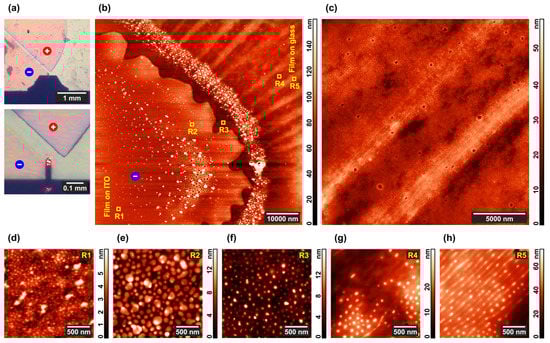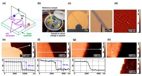The experimental design and characterization of the samples: (a) Set-up schematic; (b) image of the cell for annealing under solvent vapor and electric field; (c) optical images of the ITO electrodes and the gap between them; (d) typical AFM image of the interelectrode space after spin-coating with a copolymer film; (e) AFM image and cross-section of the electrode edge before spin-coating; (f) AFM image and cross-section of a scratch made in the PS–P4VP film; (g) AFM image and cross-section of the electrode edge after spin-coating with a composite film; (h) typical topographic images of the composite film on ITO and glass after annealing in chloroform vapor without electric field. Height profiles in the Figure (e–g) are drawn along the arrows in the corresponding topographic images.
