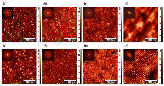 Typical AFM images of microphase-separated (top row) PS–P4VP copolymer and (bottom row) PS–P4VP/AuNR composite films after 24 h annealing in (a,c,e,g) 1,4-dioxane and (b,f,d,h) chloroform vapor (a,b,e,f) without and (c,d,g,h) with 800 V DC electric field. Two-dimensional (2D) Fourier transforms of the corresponding topographies are shown in the insets.