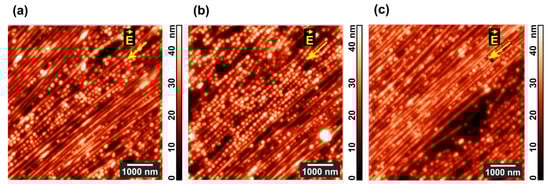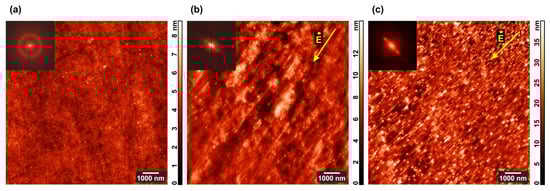 Doping by Au nanoparticles was reported to markedly increase the low-frequency dielectric permittivity of poly(vinylidene fluoride) [85], vinylidene fluoride-trifluoroethylene-chlorofluoroethylene terpolymer [86], and SU-8 epoxy novolac resin [87], being attributed to the polarization of conductive particle interfaces within the dielectric polymer matrix, known as the Maxwell–Wagner–Sillars effect [88]. Since in our case the AuNRs are selective to the P4VP blocks [80,81], they increase the permittivity of the corresponding domains thus making the dielectric contrast with PS domains even higher. This can explain more pronounced morphological changes and growth of the surface roughness caused by the same electric field applied to the PS–P4VP/AuNR composite films (Figure 2h and Figure 3c) in comparison with the PS–P4VP pure copolymer films (Figure 2d and Figure 3b).