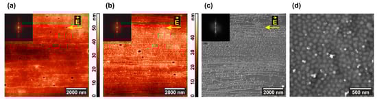 (a,b) AFM and (c,d) SEM images of the microphase-separated PS–P4VP/AuNR film annealed under chloroform vapor and DC field (a) before and (b–d) after its exposure to iodine vapor. The insets show fragments of Fourier transforms of the corresponding topographies.