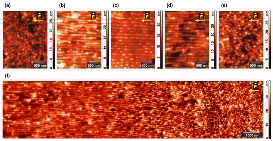 Domain structure of the microphase-separated PS–P4VP/AuNR film annealed under chloroform vapor and DC field. AFM images were taken from the (a–e) different internal areas on the way from cathode to anode and (f) large 15 μm area situated closer to the anode.