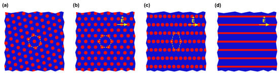 Schematic (top view) of the phase transformation in a strongly separated PS-P4VP film: (a) hexagonally packed standing cylinders; (b) field-oriented hexagonally packed cylinders; (c) lined up cylinders; (d) standing lamellas formed upon cylinder merging.