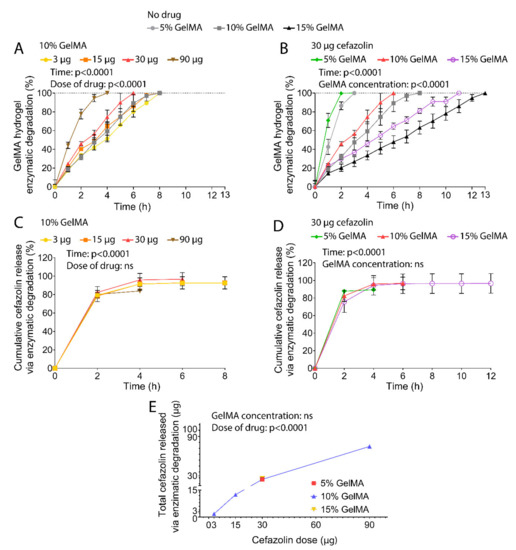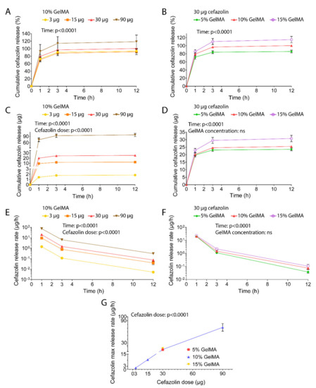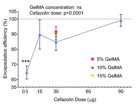 The EEs obtained here were significantly higher compared to work previously published work by Shah et al., who obtained limited loading efficiency for cefazolin in poly(DL-lactic-co-glycolic acid) (PLGA) nanoparticles [40]. In their study, Shah et al. attributed the poor EE to a combination of charge incompatibility and polymer phase concentration between the negatively charged cefazolin and poly(DL-lactic-co-glycolic acid) (PLGA) microparticles, which are relatively hydrophobic [40]. The increased EEs obtained using GelMA as a drug carrier suggest that hydrogels present a more suitable environment for cefazolin encapsulation, a finding that is in accordance with other studies [41,42,43].