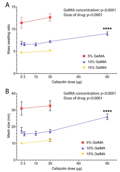 Similarly, the theoretical hydrogel mesh size decreased with increasing GelMA concentration from 5% to 15% (Figure 4B). The mesh sizes observed ranged from around 10 nm to 31 nm, which is in good agreement with other studies [26]. The dose of drug loading also significantly affected the mesh size in all GelMA concentrations. Most noticeably, the loading of 90 µg cefazolin significantly increased the mesh size of 10% GelMA. Overall, the swelling ratio and calculated mesh size indicate a potential impact of the higher doses of on the physicochemical properties of the GelMA-DDS.