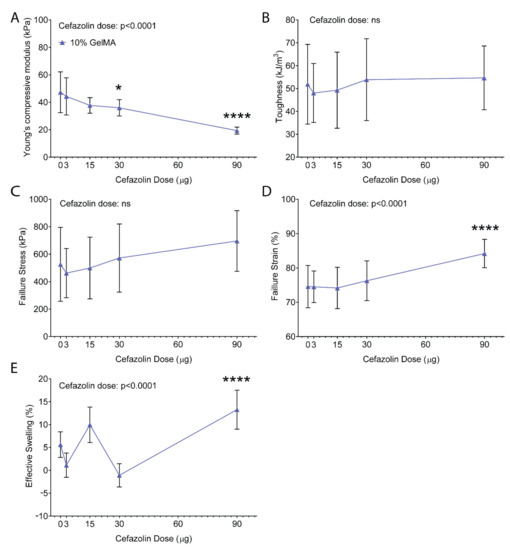 Figure 5 shows the mechanical compression testing results for 10% GelMA with and without cefazolin. In the absence of cefazolin, the compressive modulus was ~47 kPa, as expected [72] (Figure 5A). Statistical analysis demonstrated a significant effect of the cefazolin dose on the compressive moduli of the GelMA-DDS (p < 0.0001). Indeed, Figure 5A shows that loading of 90 µg cefazolin in 10% GelMA hydrogel discs resulted in a significantly lower compressive modulus than the control group (~19 kPa) which was more similar to the typical modulus of 5% GelMA hydrogels [50,72]. The hydrogel toughness and failure stress averaged from ~48 to ~55 kJ/m3 (Figure 5B) and ~462 to ~696 kPa (Figure 5C), respectively, which were unaffected by the cefazolin dose and comparable to previously published data [50,72]. The failure strain was not significantly different between 10% GelMA with and without cefazolin doses ranging from 3 to 30 µg. However, failure strain for the highest cefazolin dose (90 µg) was significantly higher, indicating a lower degree of crosslinking [50,72] (Figure 5D). Effective swelling, a measure of water uptake following incubation in a buffer, ranged from ~−1 to ~10% but was significantly higher at the 90 µg cefazolin dose (~13%), further corroborating lower crosslinking densities in gels containing high doses of cefazolin [50,72] (Figure 5E).