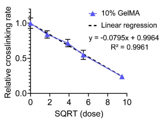 10% GelMA crosslinking rate normalized to the control sample (no cefazolin) versus the square roots of cefazolin doses. Linear regression fit showing good agreement: R2 = 0.9961.