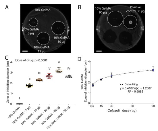 A diffusion assay was performed using Mueller-Hinton (MH) agar-containing Petri dishes. A 0.5 McFarland standard solution [37] was prepared by suspending S. aureus colonies in MH broth and obtaining an optical density at 600 nm (OD600) between 0.08 and 0.1. To each MH Petrie dish, 30 µL of the solution was added and spread homogeneously. GelMA without loaded cefazolin and antimicrobial susceptibility test discs containing 30 µg of cefazolin (Oxoid, Thermo Fischer Scientific, MA, USA) were used as negative and positive controls, respectively. Plates were incubated overnight at 37 °C, plates were imaged, and the zones of inhibition were measured using Fiji ImageJ software. The experiment was performed three times with n = 6 each time.