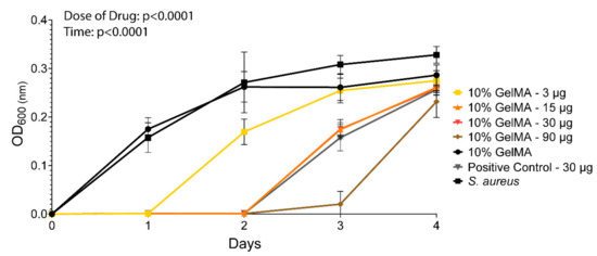 A 0.5 McFarland standard solution [37] was prepared in MH broth (5 × 108 CFU/mL), and diluted to obtain a broth inoculum at 5 × 106 CFU/mL. GelMA-DDS samples, a positive control, i.e., antimicrobial susceptibility test disc containing 30 µg of cefazolin (Oxoid, Thermo Fisher Scientific, MA, USA) and a free dose of 30 µg of cefazolin, as well as negative control (GelMA without cefazolin), were placed individually in the wells of a 48-well plate. The assay was launched upon the addition of 0.5 mL of prepared bacteria inoculum solution per well. At each timepoint (day 1, day 2, day 3, and day 4), the turbidity was measured using OD600, and a new bacteria broth solution was prepared to replace the 0.5 mL of media in each well completely. The experiment was performed three times with n = 6 each time.
