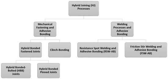 There are many recent review articles regarding joining techniques of same and dissimilar materials combining mechanical fastening, welding and the use of adhesives. The focus of these reviews is to describe the process of joining and their mechanical and physical properties via simulation and laboratory experiments [1,14,15,16,17,18,19,20,21,22]. To the authors’ knowledge, one topic that was not covered in significant detail is related to the use of adhesive in hybrid joints (combination of adhesive bonding with mechanical joining and welding processes). For this reason, in this work, an overview of recent advances on hybrid joining processes are discussed following structure (see Figure 1):
