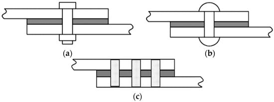 A hybrid approach of bonded fastened joints is developed in order to avoid individual limitations of fastening and adhesive joining for assembling of dissimilar materials, composites or composite materials and metallic materials. There are two types of hybrid-bonded fastened joints, such as the joints that use bolts/rivets known as hybrid-bonded–bolted (HBB) joints (see Figure 2a,b adapted from [23]), and the joints that use pins with adhesive, known as hybrid-bonded pinned joints (see Figure 2c).