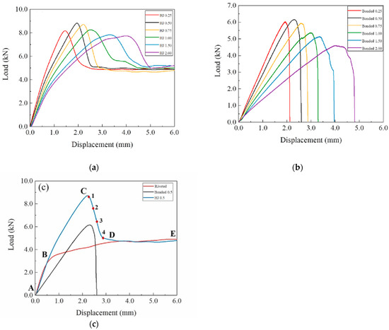 More recently, Liu et al. [62] conducted an experimental investigation of the load-bearing behavior, and ductility of FRP hybrid double-lap joints composed of both adhesively bonded and bolted connection parts was conducted. The effects of the adherends’ fiber architecture (uni- or multi-directional), adhesive type (stiff or flexible), and displacement rate were examined. The authors showed that the resistance of the hybrid joints with flexible adhesive corresponded to the full summation of the resistance of the bonded and bolted connection parts. The ultimate failure loads of these joints were significantly improved by increasing the displacement rate, while the deformation capacity did not decrease. Finally, their experimental results showed that the hybrid joints with multi-directional adherends and flexible adhesive exhibited high joint efficiencies and excellent ductility. Zhang et al. [63], systematically studied the failure behaviors of the hybrid joint (HJ) of plain-woven carbon fiber-reinforced plastic (CFRP) and aluminum alloy. The HJs were compared with bonded joints and riveted joints through experiments, and failure behaviors of the HJs were discussed. The adhesive materials used were a polyurethane and epoxy adhesive. Experimental load-displacement curves of HJs, bonded joints and riveted joints are shown in Figure 6. In Figure 6a, the curves of HJs with six different bond line thicknesses show obvious regular distribution characteristics. As the thickness of the bond line increases, the initial rigidity and peak load of the HJs decrease. When the displacement exceeds ~1.0 mm, the curves return to approximately linear until the maximum load position. The reason for this phenomenon can be found in Figure 6c. For bonded joints, the rigidity is always approximately linear. While for riveted joints, when the loading displacement is in ~0.5–1 mm, damage occurs around the holes of CFRP and the curves are obviously nonlinear. Therefore, for HJs, the nonlinear interval is caused by the damage of rivets and CFRP. It is worth noting that the curves of HJs with different bond line thicknesses fall back from the peak load to ~5 kN, and this phenomenon shows that when the bond line is completely broken, the HJs become approximately equivalent to riveted joints. The failure processes of the HJs can be subdivided in three stages (as shown in Figure 6c): first, the bond line and the rivet share the load; then the bond line gradually fractures; finally, the rivet bears the load alone. The authors concluded that HJs are superior to bonded joints and riveted joints in strength and energy absorption.