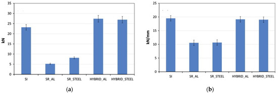 Marannano et al. [75], in 2015, carried out a numerical–experimental study of bonded/riveted double-lap joints between aluminum and carbon fiber-reinforced polymer (CFRP) laminates. They permitted to highlight both the static and the fatigue performance of such joints obtained by using aluminum and steel rivets. Figure 7a,b shows the average values of the tensile strength and the stiffness of the different junctions examined. The experimental data were obtained by tensile tests on simple adhesively bonded joints (SI), simple riveted joints (SR) with aluminum (SR_AL) and steel (SR_STEEL) rivets and hybrid joints with aluminum (HYBRID_AL) and steel rivets (HYBRID_STEEL). The authors demonstrate that the introduction of steel or aluminum rivets on an adhesively bonded joint with an overlap length equal to twice the minimum size recommended by the theory allows improvement the static strength and, especially, the fatigue performances.