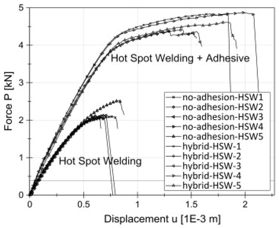 Experimental force–displacement diagrams of the spot weld joints and the hybrid joints (combining spot welding and adhesive bonding) [90].