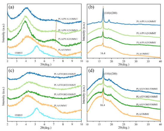 XRD curves of (a,b) PLA/PVA/OMMT; (c,d) PLA/EVOH/OMMT composite films.