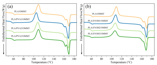 DSC curves for the second heating scan of (a) PLA/PVA/OMMT composites and (b) PLA/EVOH/OMMT composites.
