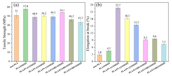 (a) Tensile strength and (b) elongation at break of PLA/PVA/OMMT and PLA/EVOH/OMMT composites.